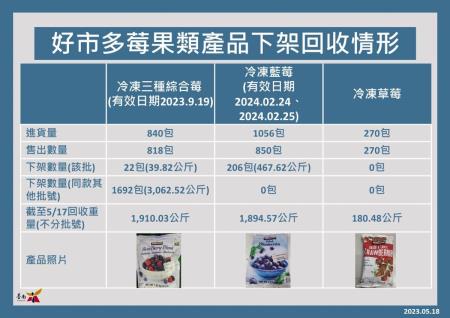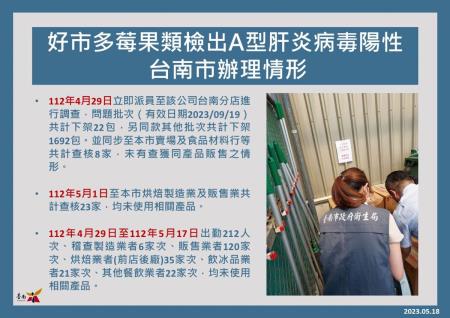 臺南市政府衛生局持續追蹤好市多股份有限公司台南分店有關受A肝病毒汙染之進口冷凍莓果回收情形,截至112年5月17日止,共計回收「Kirkland Signature科克蘭冷凍三種綜合莓」1,910.03公斤、「Kirkland Signature科克蘭冷凍藍莓」1,894.57公斤。另食藥署112年5月17日發布抽驗「Kirkland Signature科克蘭冷凍草莓(規格:2.72kg/包,有效日期:2024/08/05)」檢出A型肝炎病毒,該產品已於4月30日停止販售,5月5日全面回收已售出產品,截至112年5月17日止共計回收180.48公斤。臺南市政府衛生局持續至本市烘焙製造及販售業者查核共計204家,未有查獲同產品販售或使用之情形,另配合食品藥物管理署「112年冷凍莓果產品擴大抽驗計畫」針對轄內輸入業者進行查核,倘查獲違規將依食品安全衛生管理法處辦。